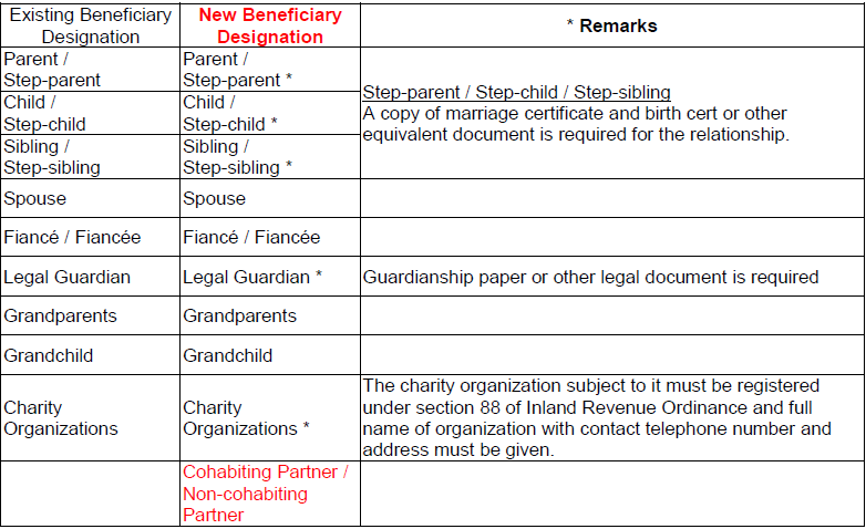 6. CTF Life will accept beneficiary as stated on the application who has insurable interest in case of death of the insured. “Insurable interest” exists when damages or losses to the insured will bring financial losses to the beneficiary of the insurance policy. The list of beneficiary designation has been updated as following: Beneficiary designation (Updated: 18 Jul 2018)