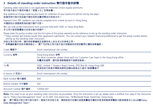 3. Any additional charge (e.g. setup fees, change of transaction amount) made by your bank for collection of your premiums will be met by the payor.