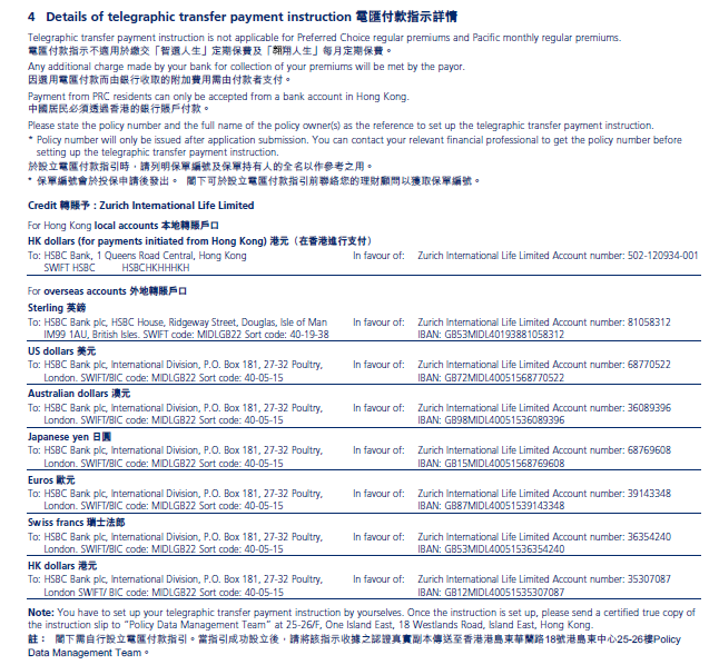 | Payee name: Zurich International Life Limited