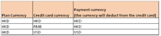 For Example, the plan is in HKD and the client would like to make the payment by the dual currency credit card (RMB/USD). If the client states to use RMB, then Zurich will deduct HKD from the credit card (as Zurich do not holding the exchange rate for RMB). However, if the client states to use USD, then Zurich will deduct USD with our fixed exchange rate 7.8 from his credit card.Please find the table in below for your reference.