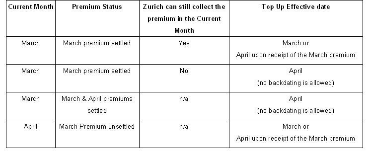 Zurich can issue the increment either from the last settled premium or the next unsettled premium due date subject to the client's request and the completion of the top up processing.